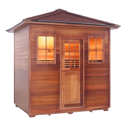 Enlighten Outdoor Hybrid Sauna | Sapphire 5 is our largest sauna ever. Unwind in the ultimate relaxation experience with space for up to 4 people. Designed with privacy in mind, this sauna uses natural Canadian red cedar wood for a long-lasting and comfortable time.